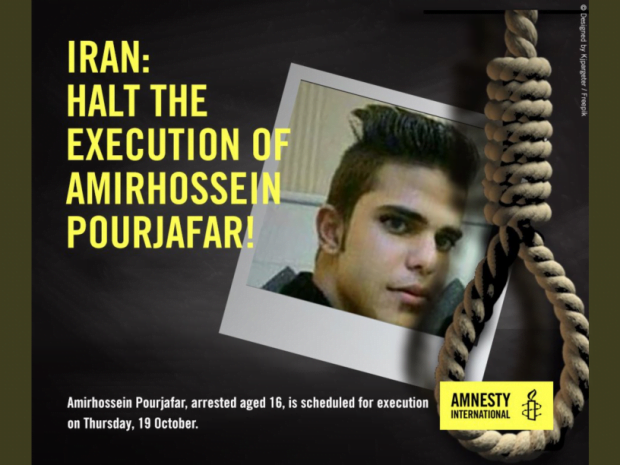 Amirhossein Pourjafar is een 17 jarige puber die op donderdag 19 oktober in Tehran zal worden geëxecuteerd.